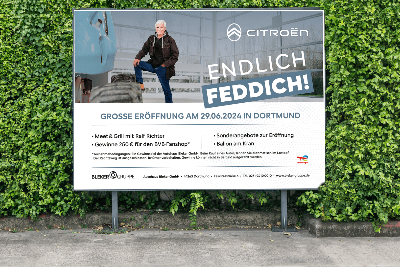 Schon zu Beginn unserer Zusammenarbeit war spürbar, dass Bleker bereit ist, neue Wege zu gehen – von regionaler Plakatwerbung über digitale Launch-Kampagnen bis hin zu Digital-Out-of-Home und Radio. Doch ein besonderer Meilenstein war die große „Endlich feddich“-Kampagne zur (Neu-) Eröffnung des Standortes Dortmund. Sie kombinierte ein starkes visuelles Motiv, ein prominentes Testimonial und eine mediale Präsenz, die im Stadtbild ebenso präsent war wie auf den Bildschirmen der Region.